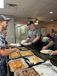 Residential Sales Executives from Clearwave Fiber serve a barbecue lunch from Barnes to Fire Department team members in Pooler, Ga.