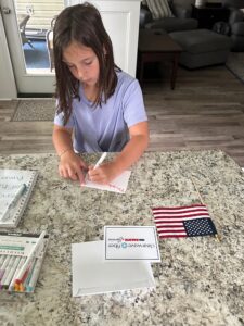 The daughter of a Clearwave Fiber employee writes a thank-you note to a member of the United States armed forces, to be mailed by the non-profit “A Million Thanks.”